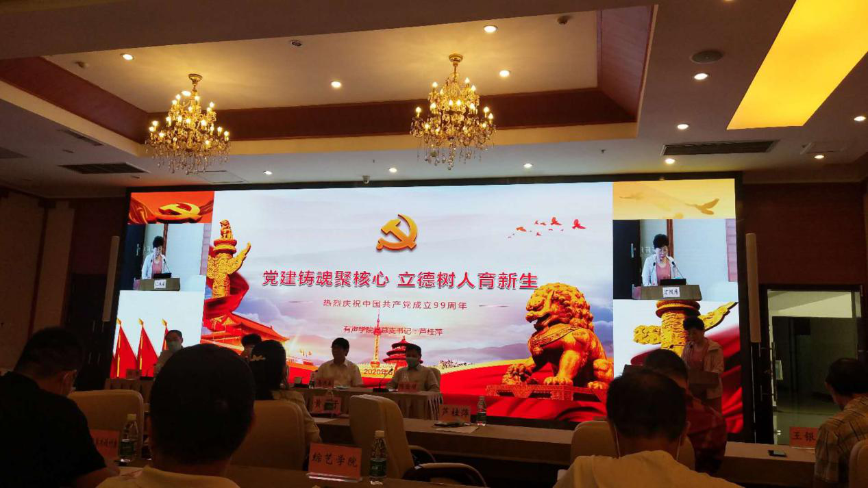 有声语言艺术学院党总支书记芦桂萍发言主题为“党建铸魂聚核心 立德树人育新生”。她指出,有声语言艺术学院“以党建带团建”,构建党建与团建工作一体化。面对此次疫情,学院利用网络媒介形式展开党的组织活动,确保新形势下的党员活动不掉队,思想政治持续进步。