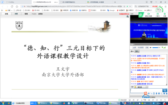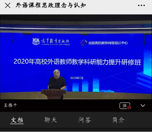 2020年7月21日14:30—16:30,高等教育出版社2020年高校外语教师教学科研能力提升研修班第一次培训课程开课,培训主题为“外语课程思政建设的认识与实践”,由华南农业大学黄国文教授与南京大学王文宇教授主讲。