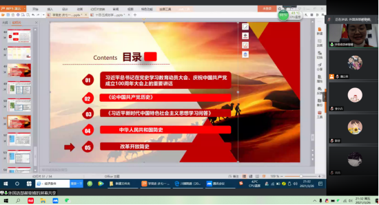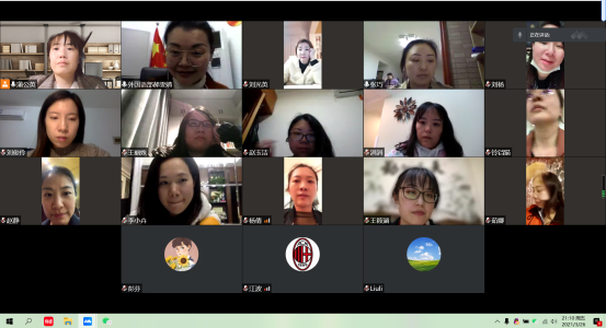 2021年3月26日星期五21:00外国语部党支部依托腾讯会议平台,召开了一次支部党员主题会议。本次会议主要议题为——党史学习会暨十四五规划学习专题会。到会成员有党支部书记郝雯婧老师,组织委员王璐老师,宣传委员蒲婷老师,以及其他党员老师共19人参与此次会议。