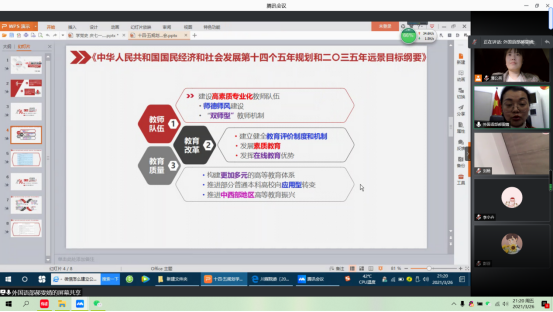 接下来进行的是十四·五规划学习专题会,分别学习了《中华人民共和国国民经济和社会发展第十四个五年规划和二〇三五年远景目标纲要》,《四川省国民经济和社会发展第十四个五年规划和二〇三五年远景目标纲要》。党员老师们就十四五规划中涉及教师队伍、教育改革、教育质量等主题的内容进行了重点学习与讨论。其中,党员老师们就“双师型”、“立德树人”、“协同育人”、“素质教育”、“产教融合”等教育理念展开了讨论。