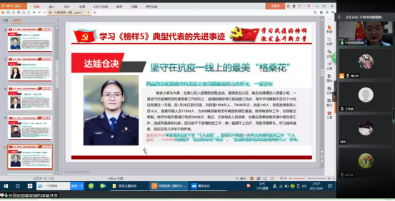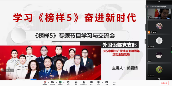 在庆祝中国共产党成立100周年、全党学习党史之际,外国语部党支部于2021年4月4日晚21:00点组织全体支部党员,以腾讯会议在线学习的方式,认真学习了由中共中央组织部、中央广播电视总台联合录制的《榜样5》专题节目中的先进事迹与伟大精神,并交流了3月22日收看节目的体会与感悟。所有党员将学习与交流的心得进行反思、总结之后形成书面学习心得提交党支部。