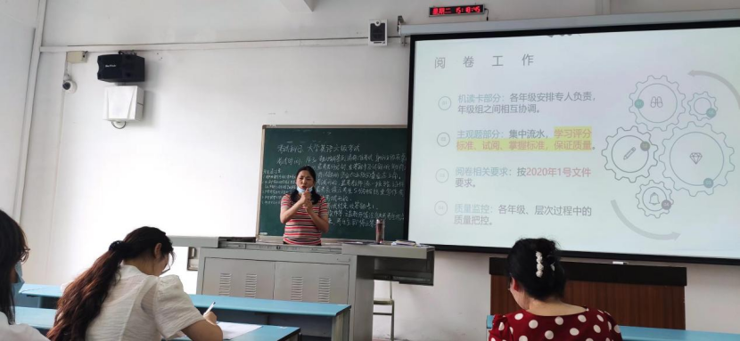 2021-2022学年第二学期《大学英语》期末考试于6月13-14日在紧张有序的氛围中顺利进行。6月14日15点,外国语部召开了期末阅卷工作专题会议。会议由外国语部主任主持,部门全体教师参会。