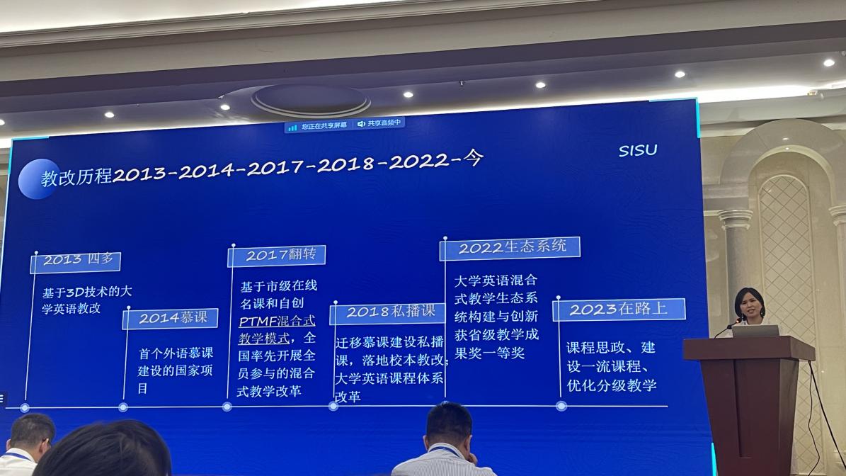 最后,四川文化产业职业学院通识教育部主任傅丽副教授围绕《赛教融合 人职融通——四川文化产业职业学院公共英语教学改革与实践》展开分享与讨论。任教授是2022年四川省高等学校省级课程思政示范教学团队“巴蜀文化通识课程群”负责人。她介绍了四川文化产业职业学院校本特色通识课程体系,公共英语课程建设,并分享了她们赛教融合、人职融通所取得的成绩。通识教育课程体系采用123思路。1. 一元:以文化育人为培养主线。2. 双核:突出“职业核心素养”和“职业核心技能”的课程设计。 3. 三通:打通学科壁垒,联通专业教育,通达人性事理,再基于本地坐标巴蜀特色来打造。从困局到破局讲述职业院校公共英语课程的建设,任教授侃侃而谈娓娓道来。最后,任教授呼吁大家聚焦主赛道、师生同奔赴,让老师们走出书本和讲台,实现自我成长和反思。