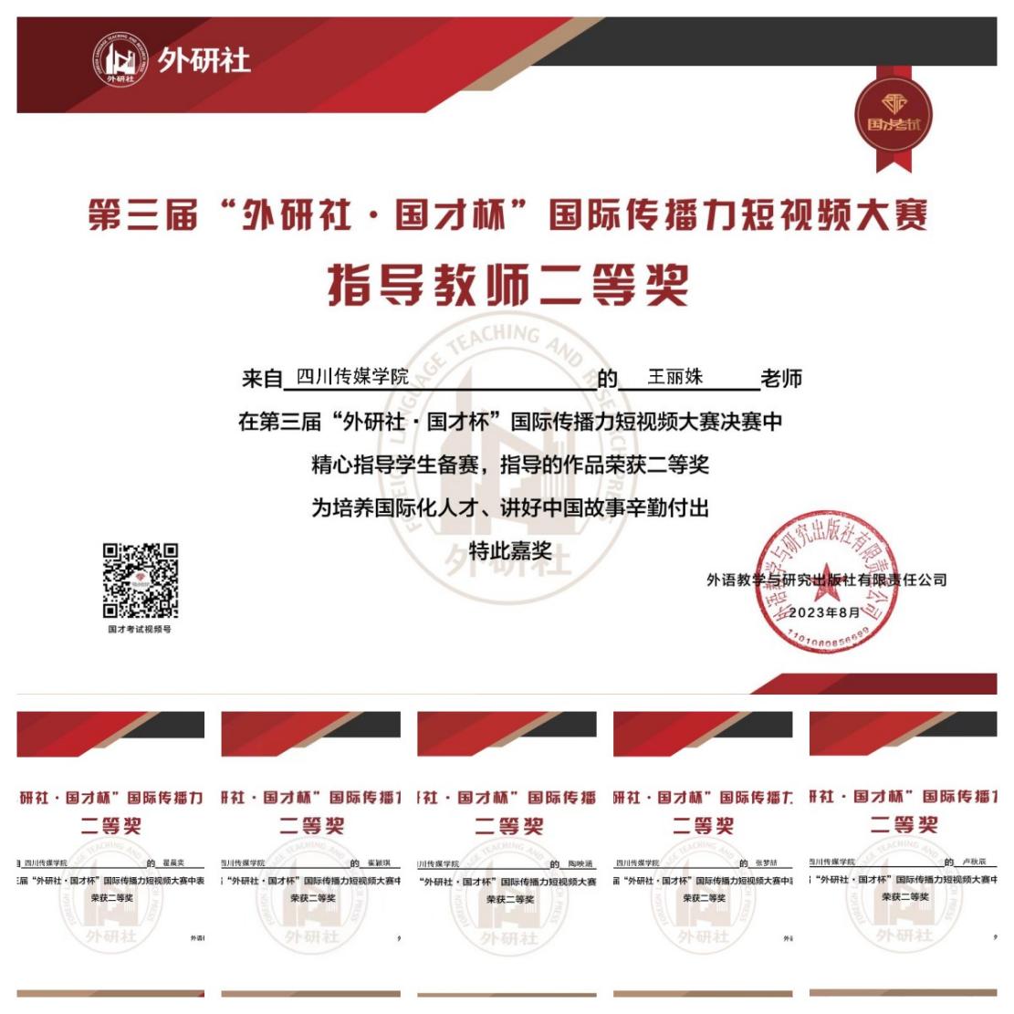 第三届“外研社·国才杯”短视频大赛于8月28日圆满结束。本次大赛吸引了来自全国729所院校的1w+大学生积极参与。经过专业评审及大众投票,四川传媒学院翟晨奕学生团队的参赛作品获得本次大赛全国二等奖。外国语部王丽姝教师作为指导教师,获得指导教师二等奖。热烈祝贺!