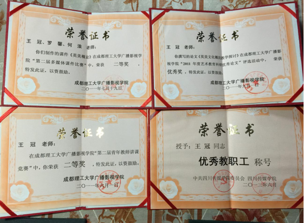 四川传媒学院“第二届多媒体课件比赛”荣获二等奖、科研优秀论文奖、讲课比赛二等奖;