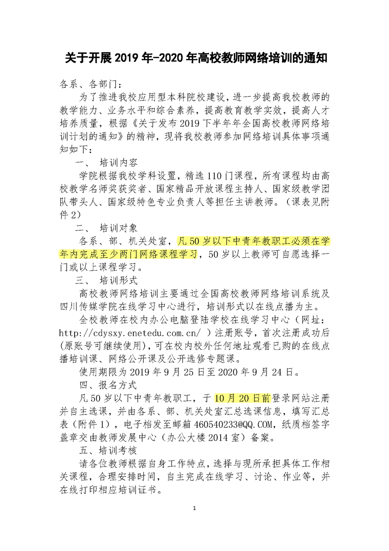 关于开展 2019 年-2020 年高校教师网络培训的通知