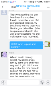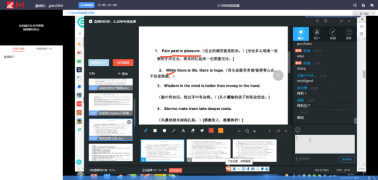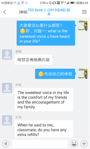 2、张强老师采用直播的形式进行授课,在讲解翻译的时候让学生们都把自己翻译的内容发到聊天框里,让学生能紧跟着老师的教学内容。(见下图)