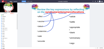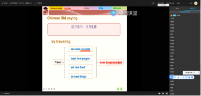 3、何梦颖老师用思维扩散的方式给学生讲解单词,同时还结合了同义的中国谚语来讲解。让学生更容易把中西文化结合起来。(以下为课堂截图)