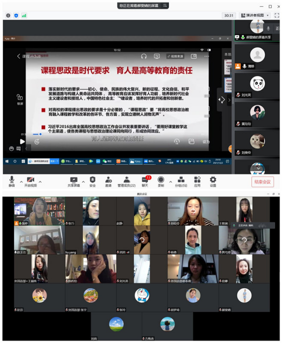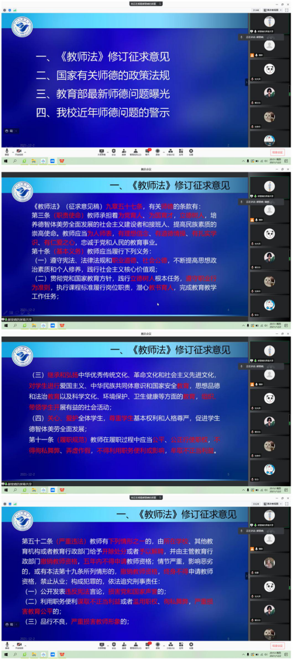 2021年12月2日晚,中共四川传媒学院机关总支委员会外国语部支部委员会以在线(腾讯)会议形式召开了“修师德 塑师风”主题学习会议。本次会议两大议题分别为:继续深入学习、讨论由教育部高等教育司指导、全国高校教师网络培训中心主办的高校教师课程思政教学能力培训;学习《教师法》(修订草案),深刻理解师德师风建设的重要性。外国语支部委员会全体党员同志参加了会议。会议由支部书记郝雯婧同志主持。