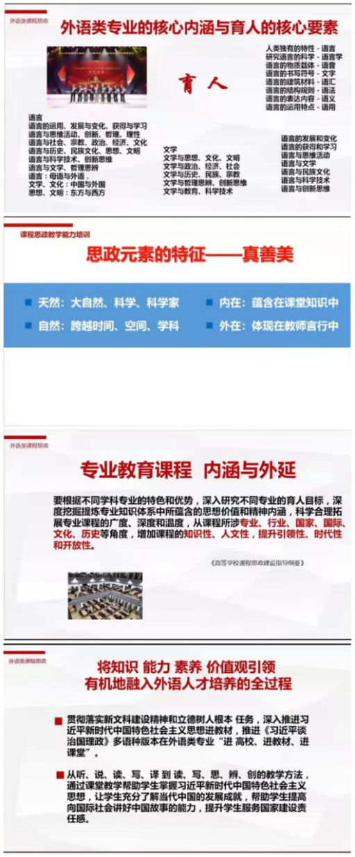 本次会议中,党员教师们再次深入学习了有关外语类人才培养的课程思政内涵、外语专业的育人核心要素、如何更好的把握外语课程教育的内涵与外延等。讨论中,党员教师们深刻理解了:要将知识、能力、素养、价值观引领有机融入外语人才培养的全过程;课程思政不仅要蕴含在课堂知识中,更要体现在教师的言行中。教师的责任在于做学生学习的指导者和人生的引路人。高尚的师德就是一本好的教科书,就是一股强大的精神力量。