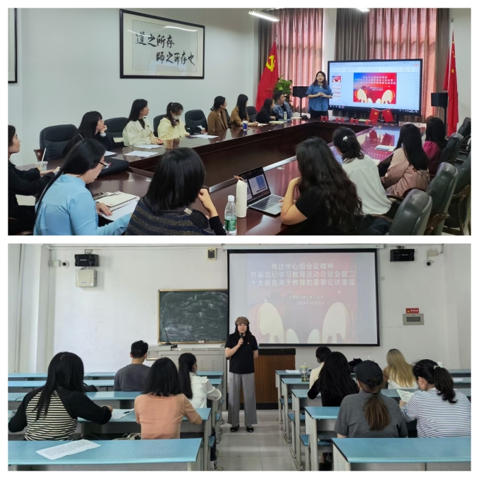 2024年10月,外国语部党总支第一、第二教工支部分别开展了党纪学习教育活动总结会暨二十大报告关于教育的重要论述重温活动。两位支部书记强调了党纪学习教育活动对于加强支部建设、提高党员素质具有重要意义,并带领党员教师重温二十大报告关于教育的重要论述,旨在通过学习帮助党员教师更好地把握教育工作的方向和重点。