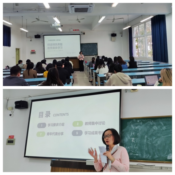2024年10月22日,外国语部第二教研室在A1-311教室举办了一场主题为“师德师风”的专题教育集体学习活动。此次活动旨在提高教师的职业道德素养,营造良好的教育环境,为培养新时代优秀人才贡献力量。