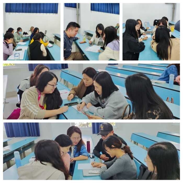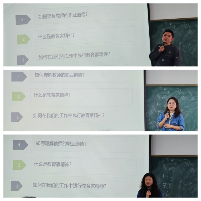 随后,全体教师通过报数游戏分成5组,就“如何理解教师的职业道德”、“什么是教育家精神”和“如何在工作中践行教育家精神”三个问题进行了深入讨论。每组派代表分享了讨论成果,现场气氛热烈。